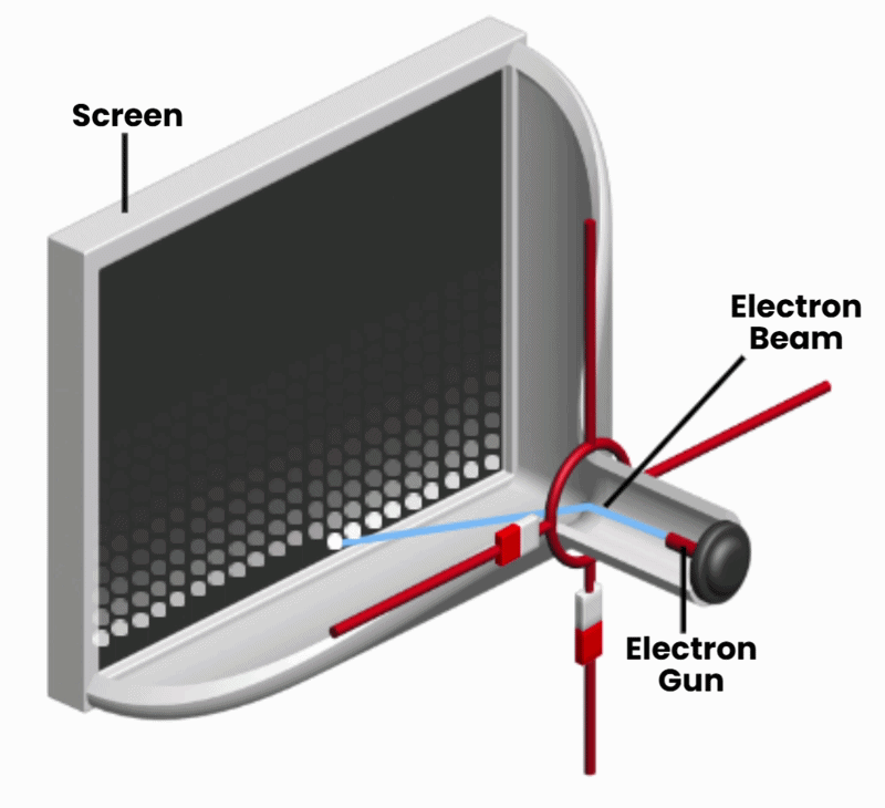 Here you can see the adjustment of the Vertical deflection coils changes the movement of the electrons vertically, along with the Horizontal deflection coils changing the electron beams direction horizontally. If you have understood this, you will understand that this way of depicting an image requires each pixel to be shown individually at once. To make the image actually visible, the vertical coils are regulated at a frequency of 50 to 60 H,z and the horizontal coils work at several thousands of times per second. This was required for the display to have a refresh rate of 60Hz.